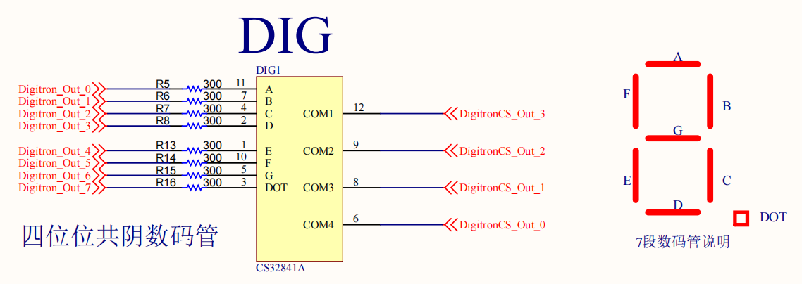 数码管是共阴数码管,高电平有效,从左到右依次编号3-0。注意,为了节约硬件资源,四个数码管共用一套(七个)灯管控制信号,也就是说,这七个灯管控制信号同时连接了四个数码管的同一个位置。因此,如果需要分开控制这四个数码管,需要配合选通信号进行动态刷新。四个数码管各有一个选通信号,低电平有效。在每一个时刻可以选择只让一个选通信号有效,在同一时刻输入这一位的灯管控制信号,随后在下一个时刻让下一个数码管的选通信号有效,输入这一位的灯管控制信号,循环往复。