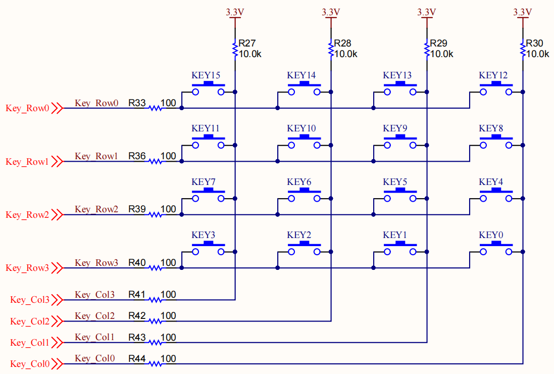 键盘为行和列扫描,必须使用列作为输入,同时也必须行作为输出,原因是我们需要将行信号接入低电平,这样在这一行中间的一个按键被按下后,相应的电平才会被拉低。因此按键的有效信号是低电平。根据原理图,由于对于需要使用的行我们都需要将行信号接低电平,因此在同一列上的任何按键被按下时,列信号都会得到低电平。也就是说,我们没有办法分辨一列上的哪个按键被按下。因此如果需要让十六个按键都有效,我们需要使用和动态刷新类似的动态扫描方案。这里不多赘述了。行号和列号分别从上到下从左到右为3-0。